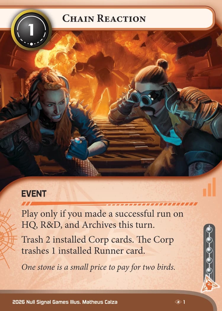 As much I like Deep Dive, I equally hated Apocalypse. Board resets are often NPE events if you don’t plan for them, and sometimes even if you see them coming1. This feels like a significantly less NPE version as it doesn’t completely hose a giant glacier setup or a very wide board, and the Corp can somewhat mitigate the impact depending on which ice were trashed by potentially nuking a specific icebreaker. You still need to play around this as Corp though, because if they land the first one, it can make the second and third (and fourth and fifth) easier to land. There’s a lot of big, expensive ice out there, and new ways to ‘cheat it out’, so its good we have a card that deals with that. In a pinch, this can also ‘solve’ an Anoetic/Skunkworks remote so it’s certainly not a narrow use-case card.
