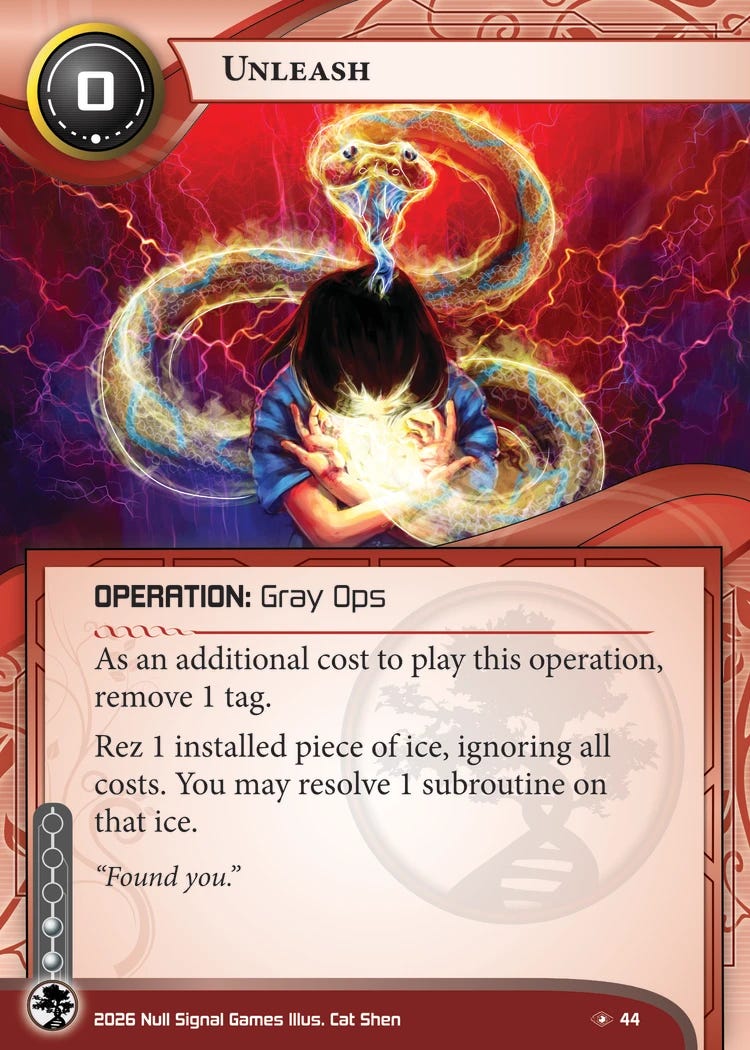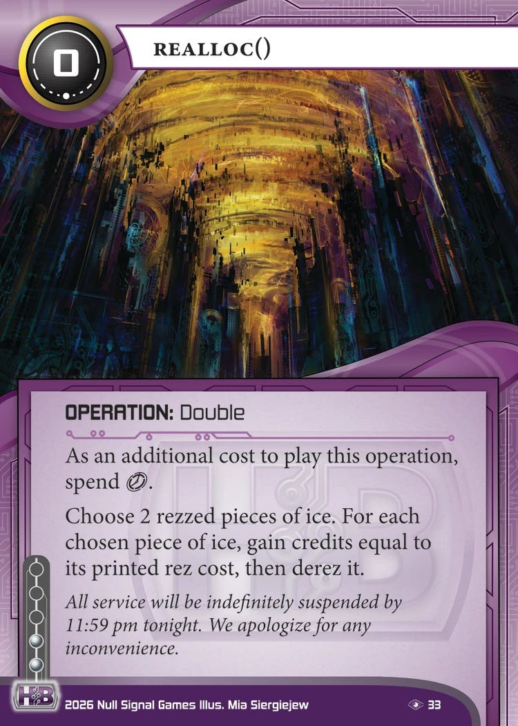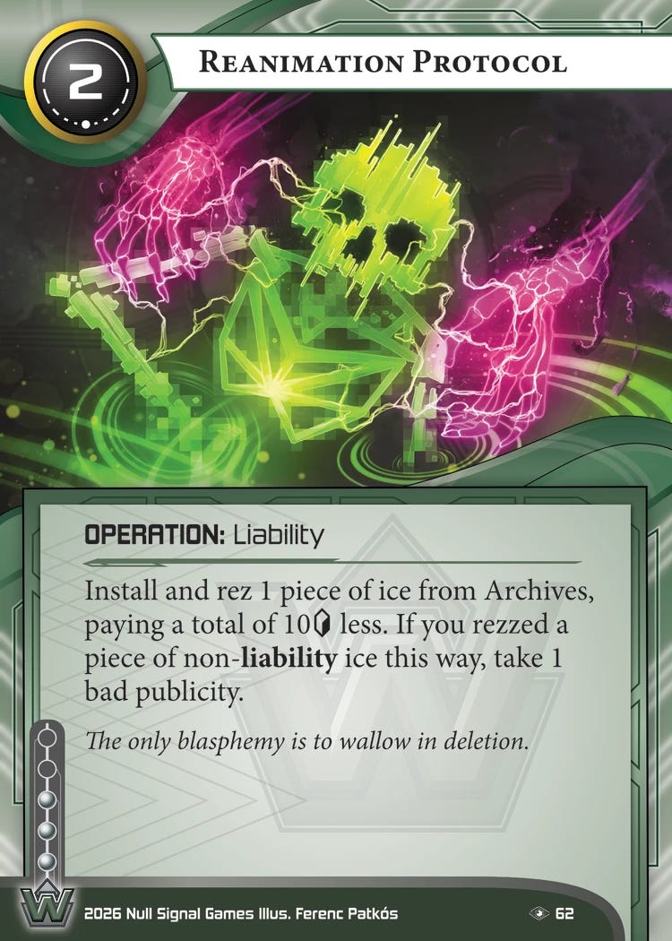 I love the flavor of this card, and I hope it ends up being good or least playable2. In theory, you can use this to get rid of bad pub permanently by rezzing it on the runner’s turn and then overwriting it. Of course, if you’ve done all that just to cheat out a giant piece of ice, you’ve erased the efficiency gains of cheating the ice out in the first place, so I don’t think this belongs in the same deck as Reanimation Protocol.