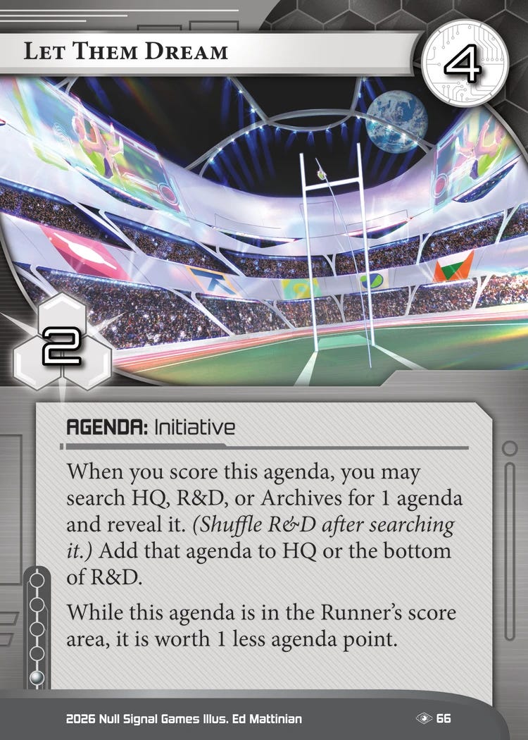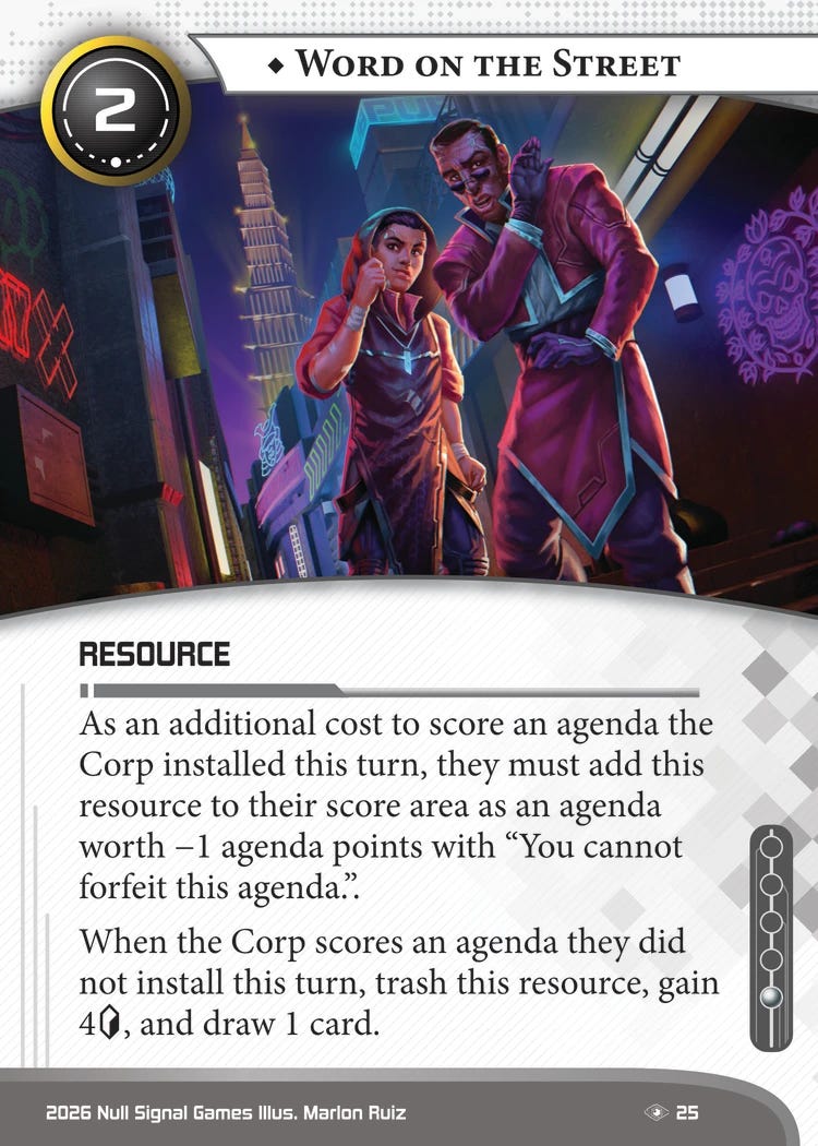 The neutral corp card, on the other hand, is pretty real. 4/2s have to be pretty good to see play and this one is excellent, effectively reducing the Corp’s agenda point density. It also lets you put a 5/3 on the bottom, which can be extremely important to reduce the chances of the runner getting lucky if you’re doing glacier-y things. This card plays best in a deck with Seamless or other tools that help Never Advance, because unlike Offworld it is tempo negative and that’s a significant tradeoff.